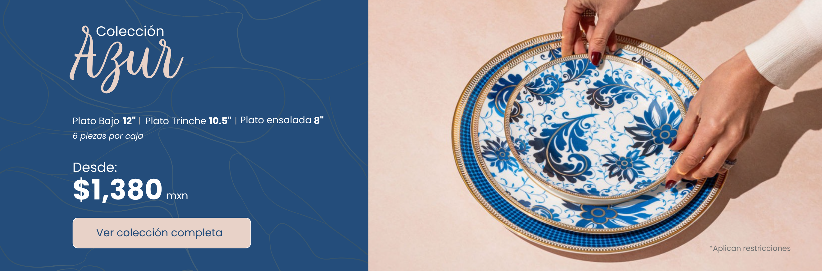 La colección AZUR evoca sofisticación y armonía a través de su diseño refinado. Cada pieza combina un elegante contorno dorado con una vibrante línea azul que enmarca un fondo blanco puro, generando un contraste visual que resalta la presentación de cada platillo sin robarle protagonismo. Es una línea pensada para mesas donde el detalle y la estética son esenciales, logrando un equilibrio perfecto entre distinción y ligereza.