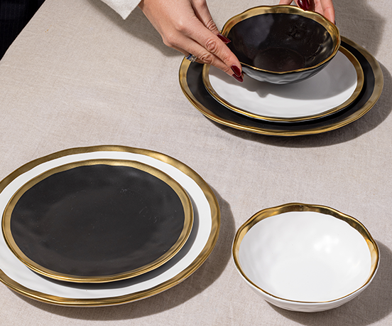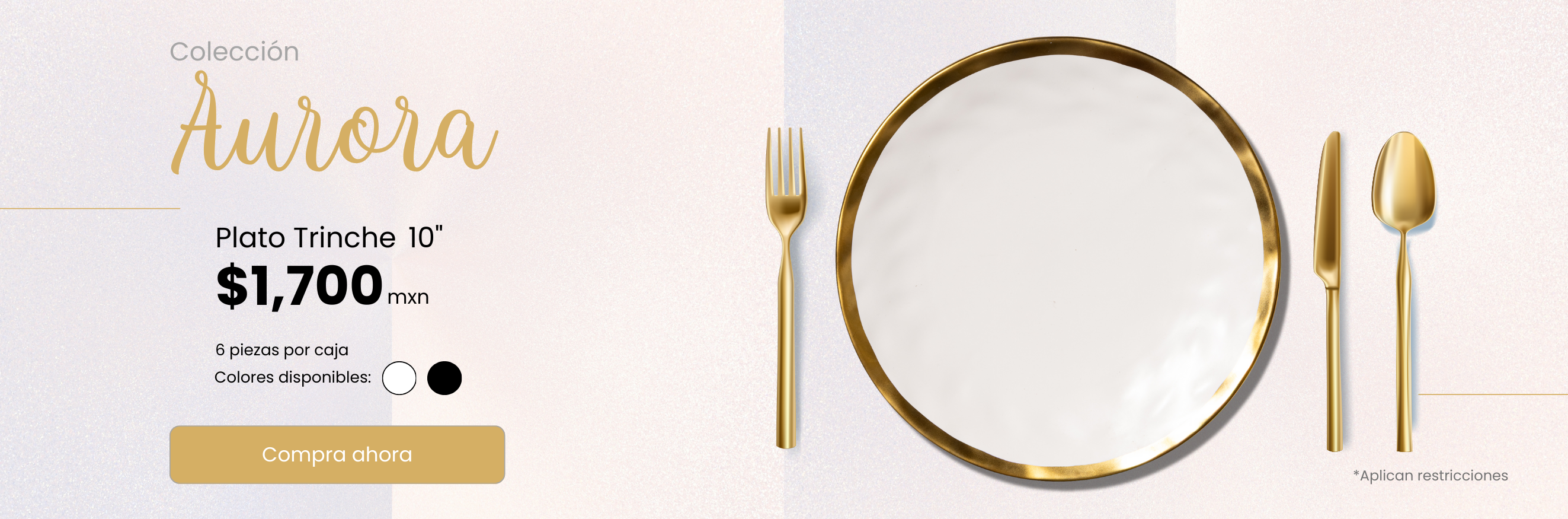 AURORA es una celebración de la elegancia sobria. Con un fondo negro texturizado que aporta profundidad y carácter, cada pieza está cuidadosamente delineada con un contorno dorado que acentúa su presencia sin recurrir al exceso. Esta línea fue diseñada para mesas que buscan sofisticación con personalidad, especialmente cuando se combina con mantelería blanca o entornos luminosos: el contraste realza no solo el plato, sino también el ambiente.